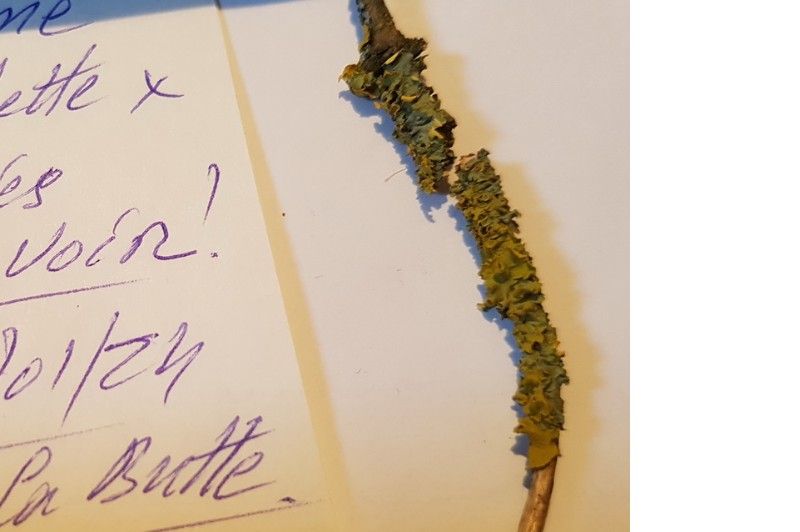 Remarque : Groupe d'une quinzaine de thalles sur branche tombée au sol.